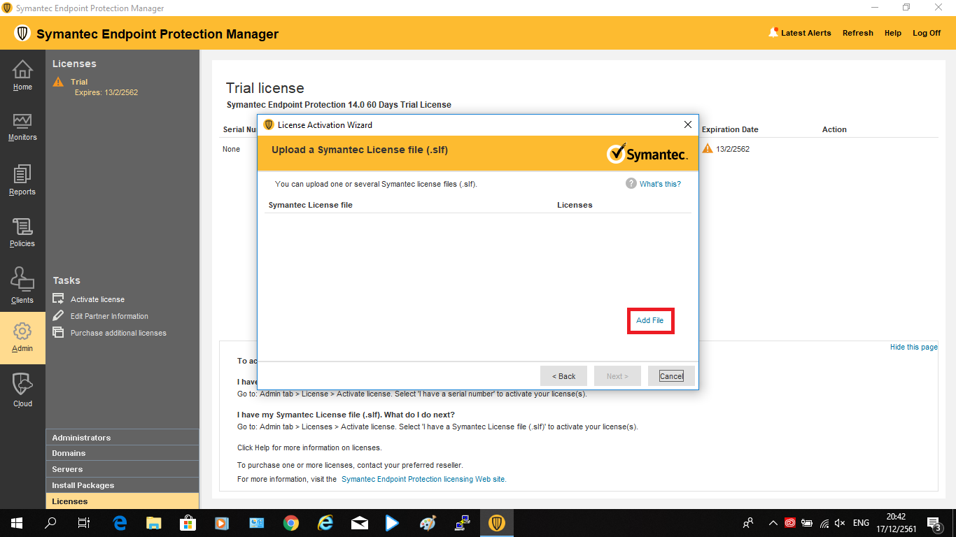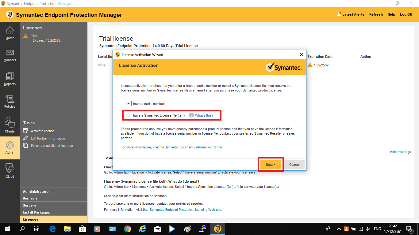 3. เลือก “I have a Symantec License file (.slf)” (หรือจะเลือก I have a serial number ก็ได้) จากนั้นกด “Next”