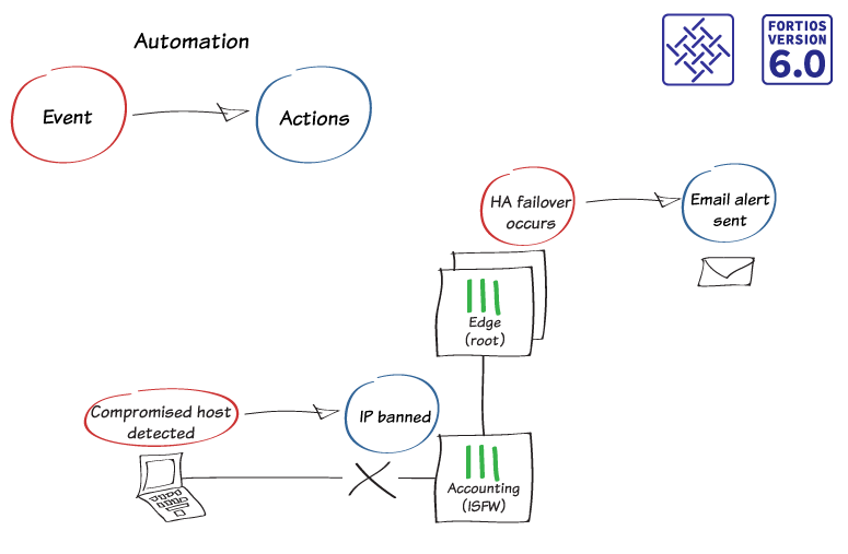 ในกรณีนี้ คุณกำหนดค่า Automation stitches สำหรับ Fortinet Security Fabric โดยแต่ละ Automation pair จะมี event trigger และมี Action อย่างน้อยหนึ่งอย่างซึ่งช่วยให้คุณสามารถตรวจสอบเครือข่ายของคุณ และดำเนินการที่เหมาะสมเมื่อ Security Fabric ตรวจพบภัยคุกคาม คุณสามารถใช้ Automation stitches เพื่อตรวจจับเหตุการณ์จากแหล่งใดๆ ใน Security Fabric และใช้การดำเนินการกับปลายทางใดๆ ได้