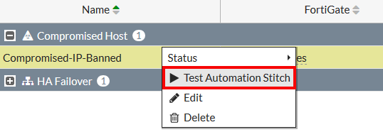 2.1 => หากเวอร์ชั่น FortiOS ของคุณเป็น 6.0.2 หรือสูงกว่า ในการทดสอบ Automation stitches ให้ไปที่ “Security Fabric > Automation” คลิกขวาที่ Automation และเลือก Test Automation Stitch