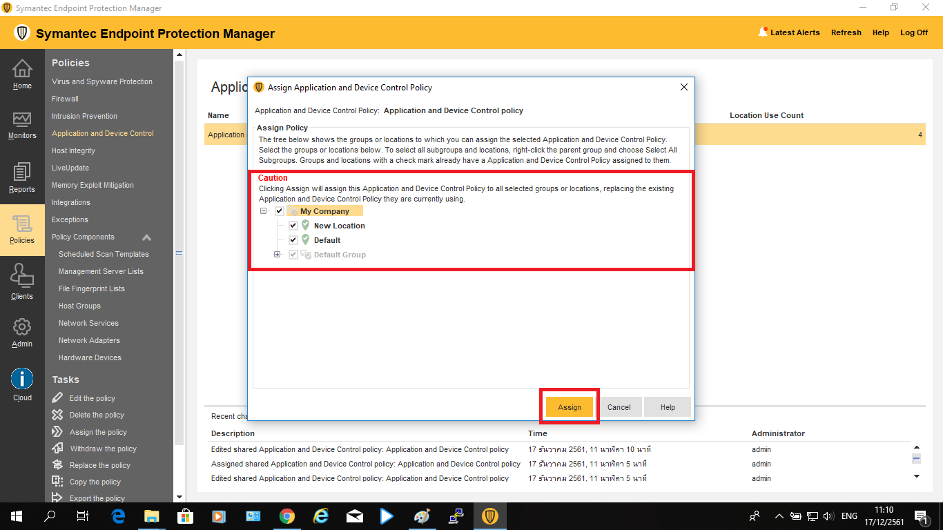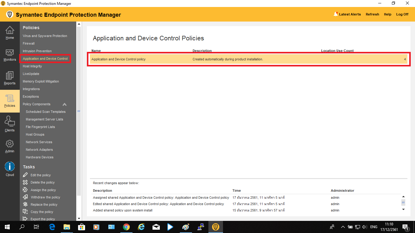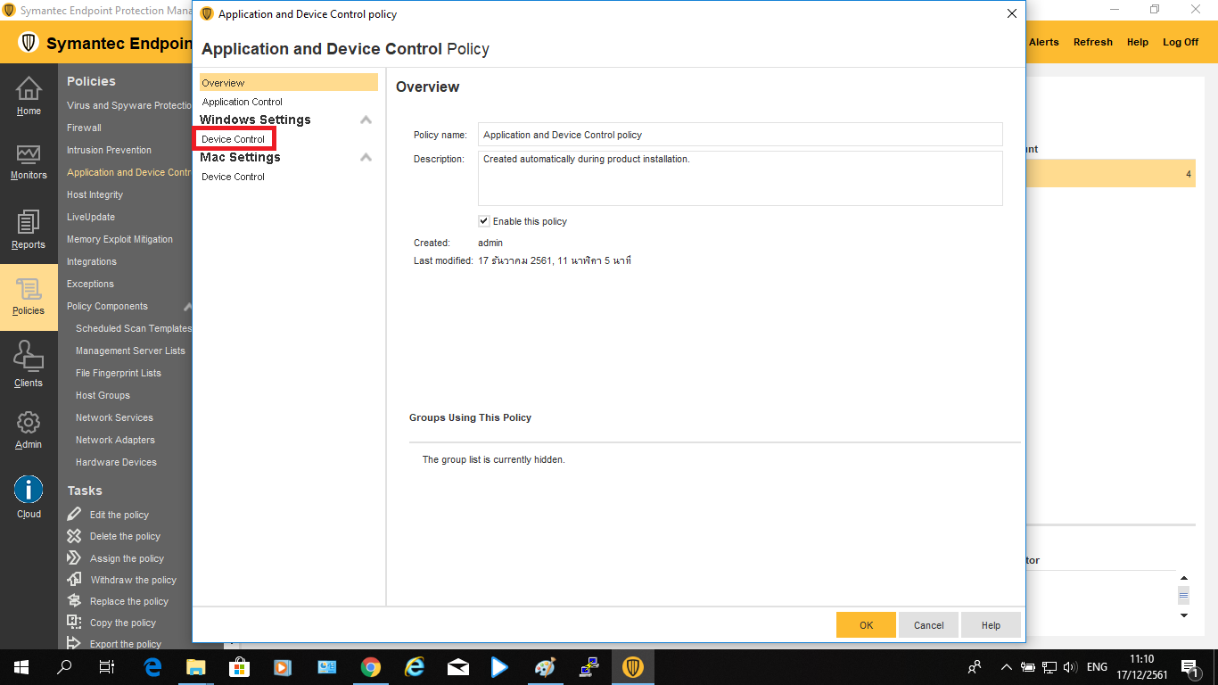 18. ที่แถบสถานะจะแสดงว่าได้มีการ Assign Policy ที่ชื่อ Application and Device Control policy ลงไปแล้ว