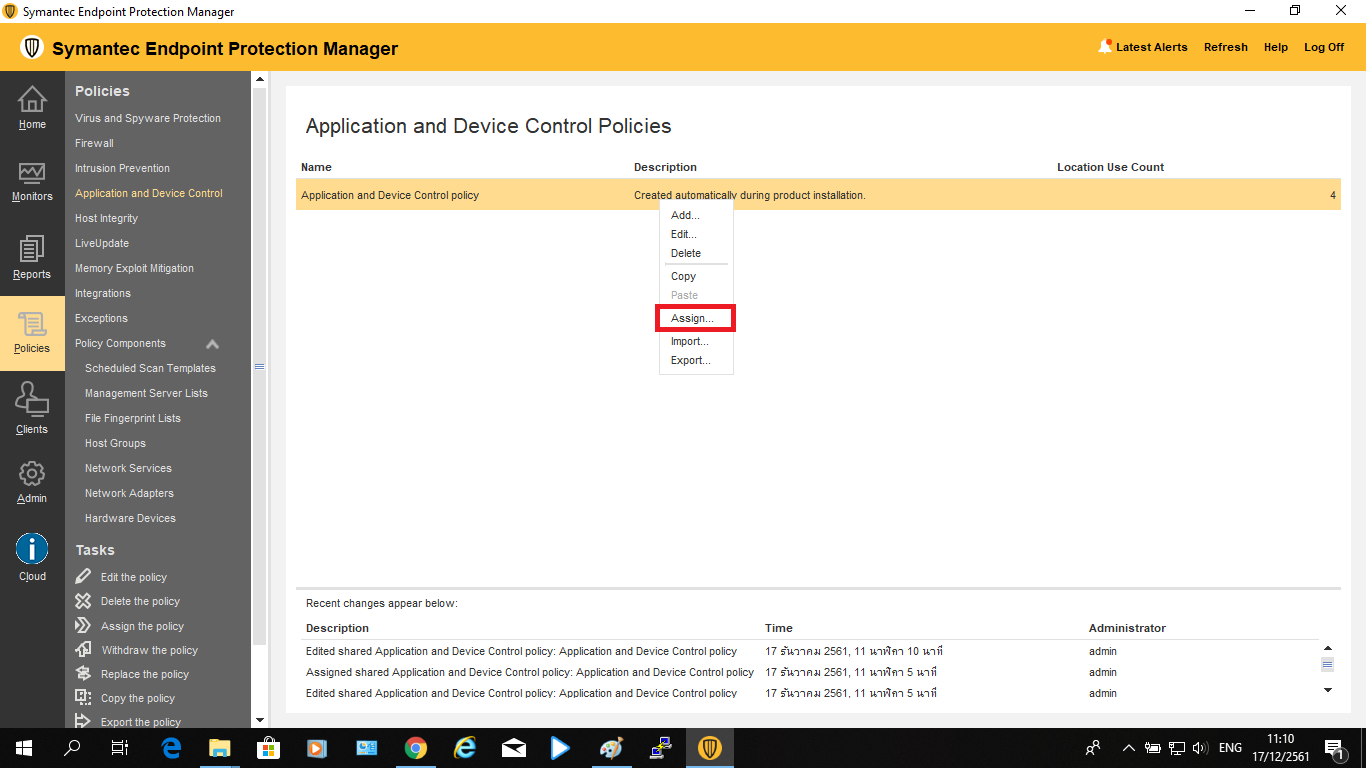 15. คลิกขวาที่ Application and Device Control policy แล้วเลือก “Assign”