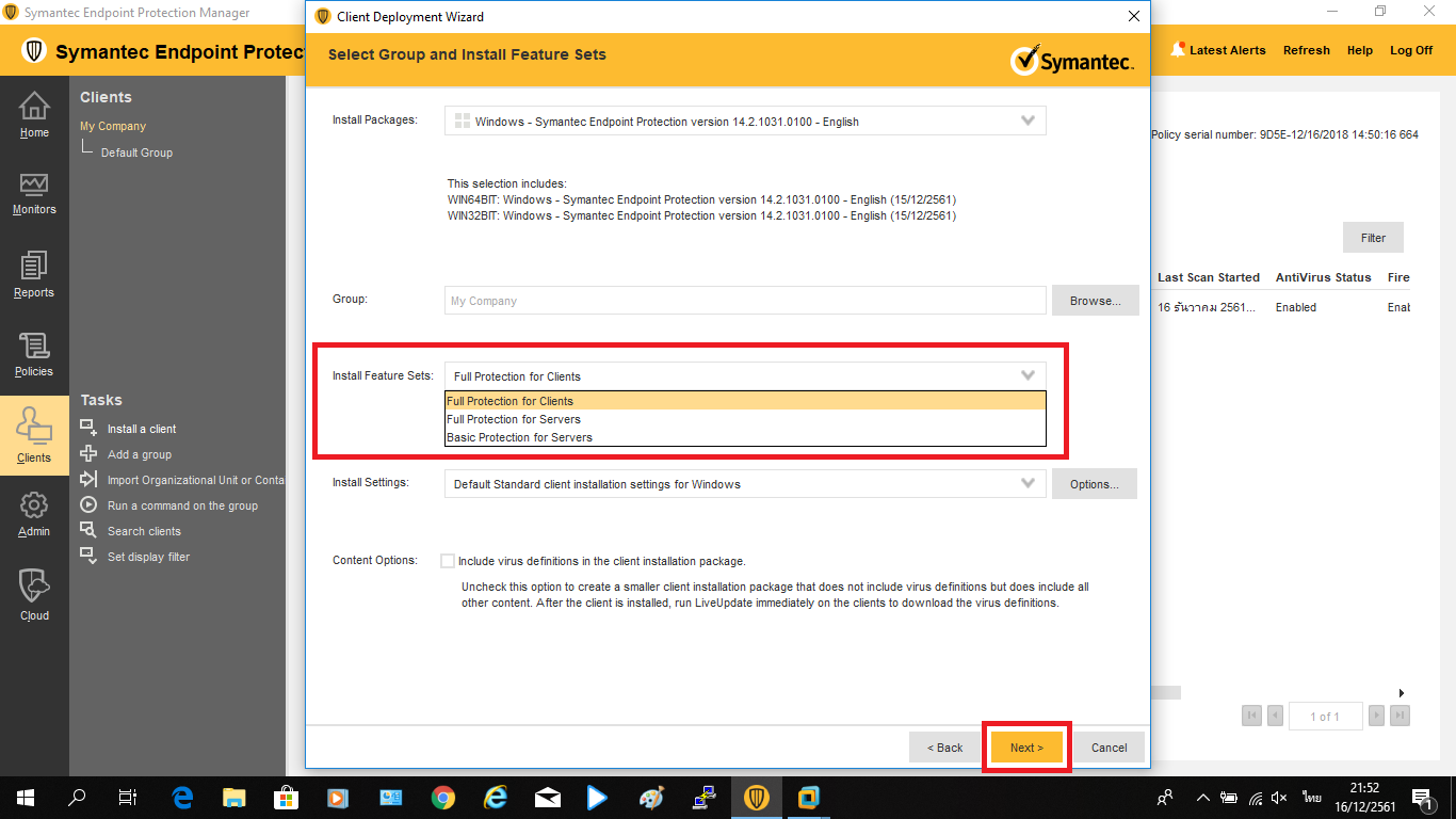 3. เลือก Package ที่ต้องการจะติดตั้งว่าต้องการไปติดตั้งที่เครื่อง Server หรือเครื่อง Client จากนั้นกด “Next”