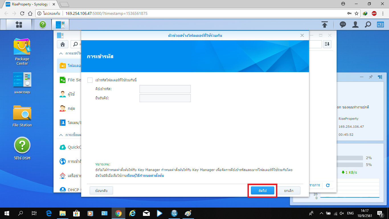 5. กำหนดการเข้ารหัสโฟลเดอร์ที่ใช้ร่วมกันที่จะสร้าง หรือจะไม่ใส่ก็ได้ จากนั้นกดปุ่ม “ถัดไป”