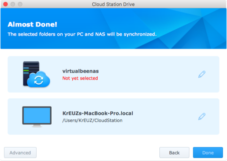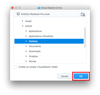 4.6 กดเครื่องหมายดินสอในช่อง PC เพื่อเลือกที่เก็บไฟล์จาก NAS **นำเครื่องหมายถูกออก ในช่อง Create an empty CloudStation folder** กด “OK” จากนั้นกด “Done” เพื่อจบการสร้าง Cloud Station Server Drive ใน PC