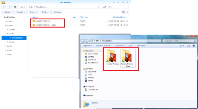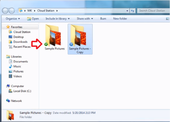 6. ในการใช้งาน เมื่อ Copy File ไปยัง Folder ของ Cloud Station ระบบจะทำการ Sync ข้อมูลโดยอัตโนมัติ สังเกตสัญลักษณ์ ตรง Icon ของ File ถ้าเป็นสีเขียวแปลว่า Sync สำเร็จ