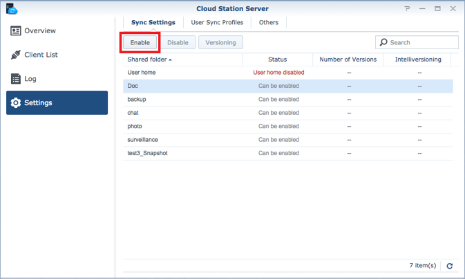 3. เลือก shared folder ที่ต้องการ จากนั้นกด “Enable”