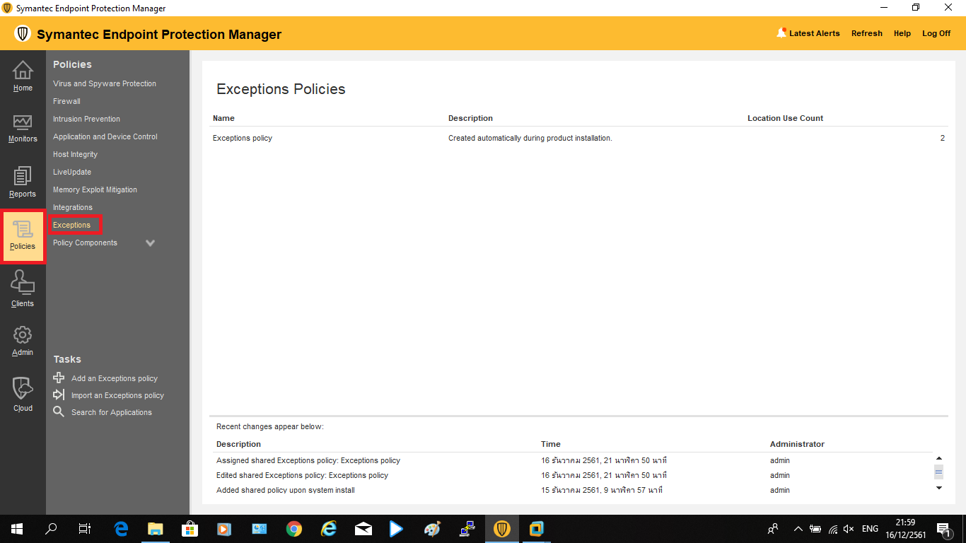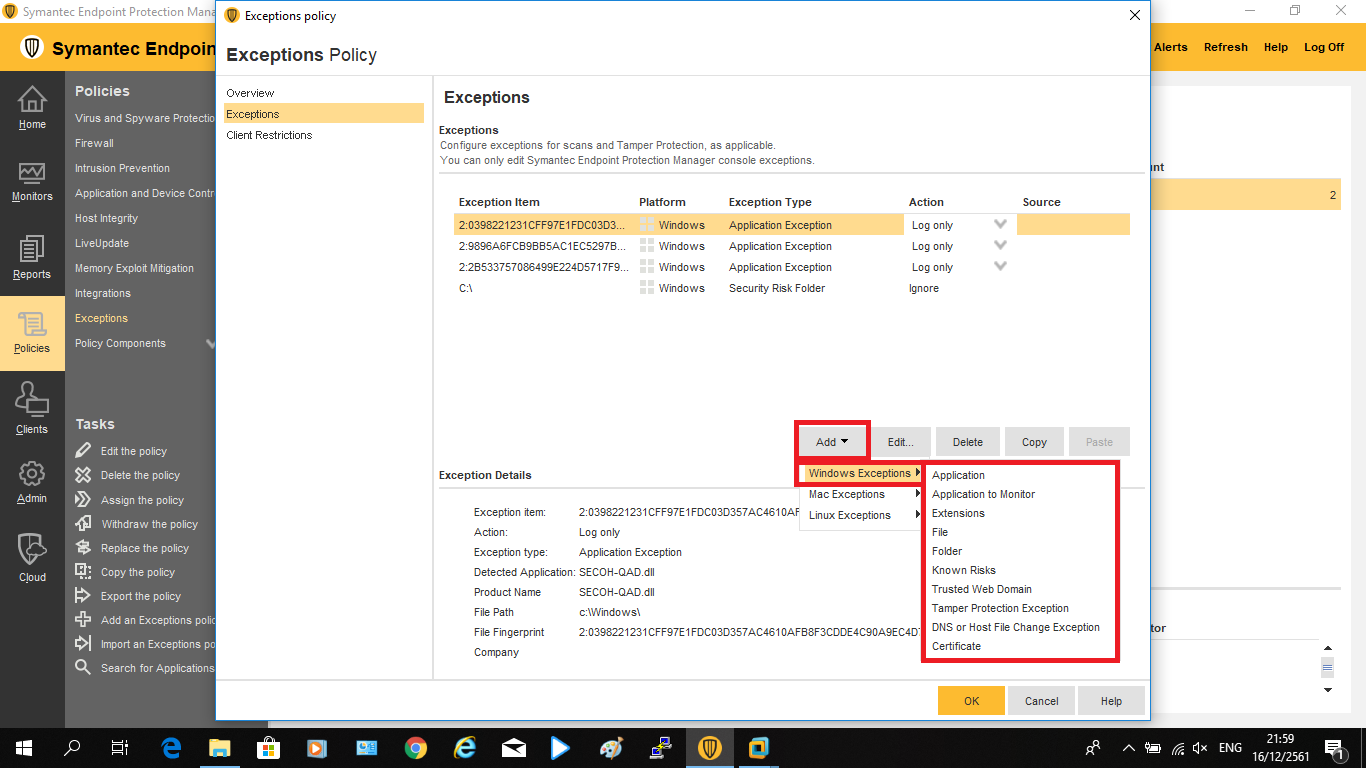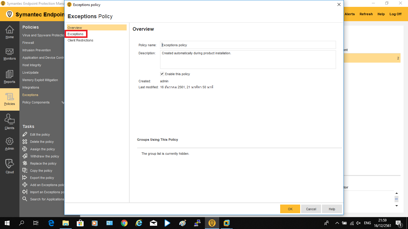 • 1. กดเข้าไปที่ Policies ที่แถบเครื่องมือด้านซ้ายของโปรแกรม จากนั้นเลือก “Exceptions”