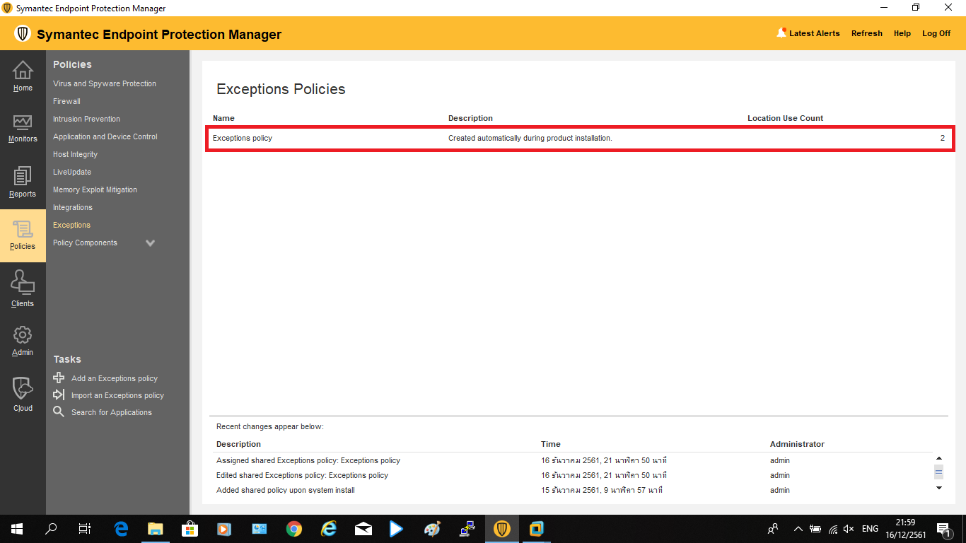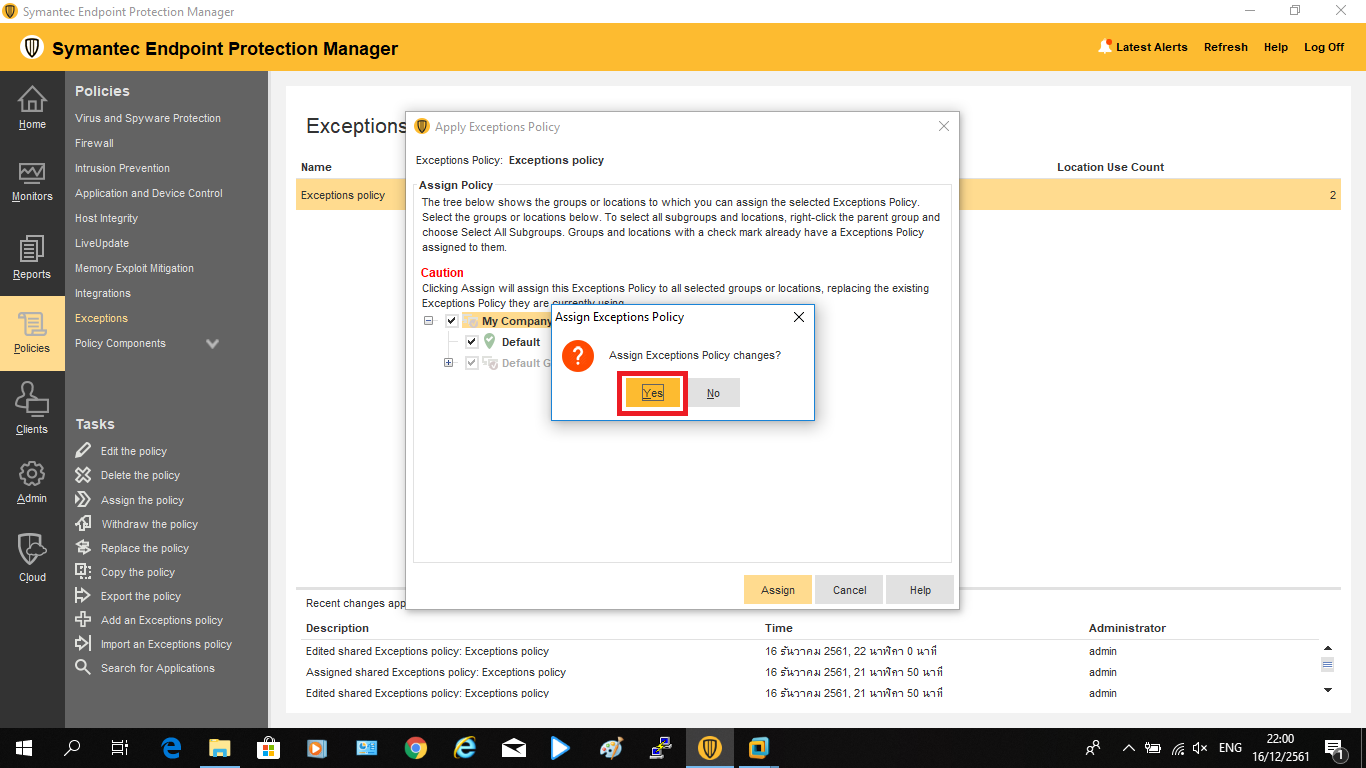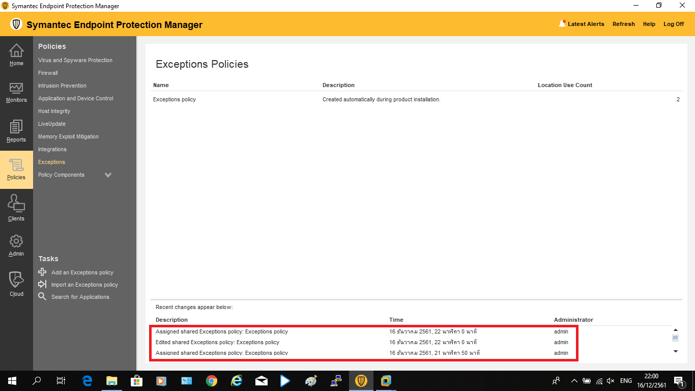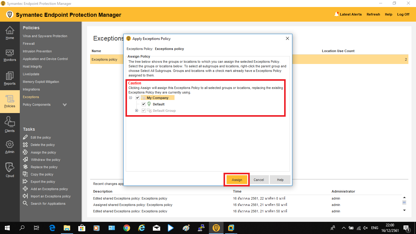 11. ที่แถบสถานะจะแสดงว่าได้มีการ Assign Policy ที่ชื่อ Exception policy ลงไปแล้ว