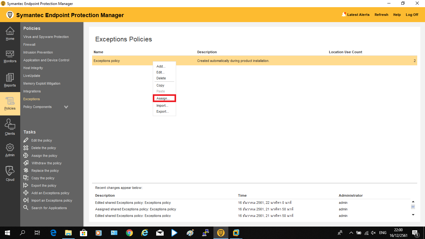 8. คลิกขวาที่ Exceptions policy แล้วเลือก “Assign”
