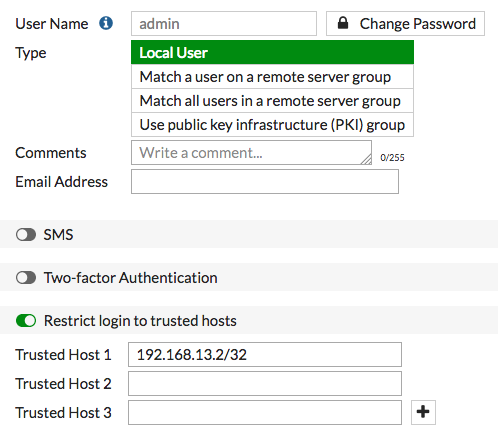 => เปิดใช้งาน “Restrict login to trusted hosts”, ตั้งค่า "Trusted Host 1" เป็น Static IP Address ของคอมพิวเตอร์ที่คุณใช้เพื่อจัดการ FortiGate