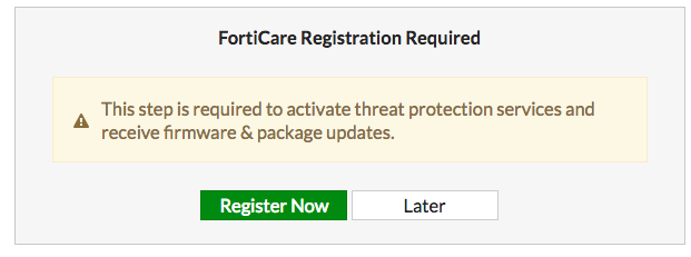 1.1 => เชื่อมต่อกับ FortiGate ของคุณ จากนั้นจะมีข้อความปรากฏขึ้นมาเพื่อแจ้งว่าจำเป็นต้องทำการลงทะเบียน FortiCare ให้เลือก “Register Now”