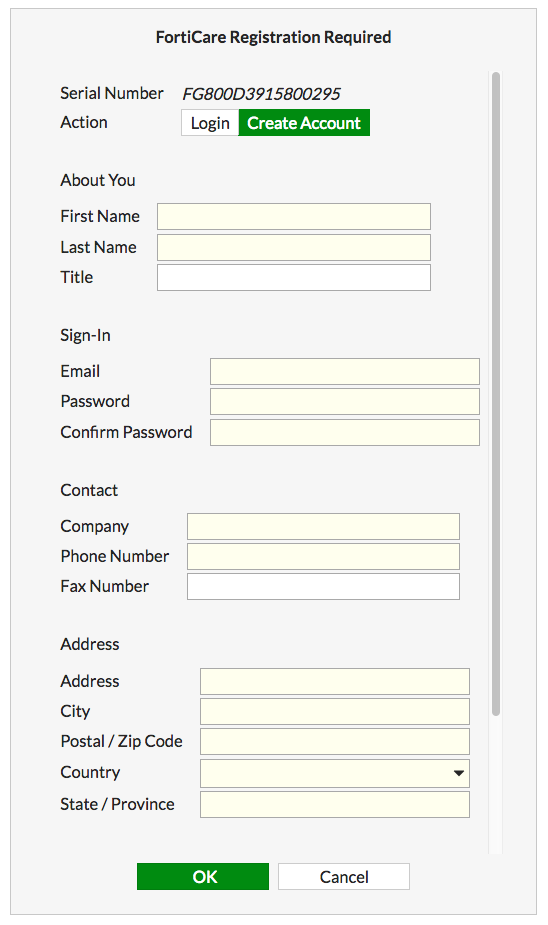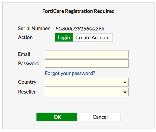 1.2 => หากคุณมีบัญชีสนับสนุนของ Fortinet, ให้ตั้งค่า “Action” เป็น Login หากคุณต้องการสร้างบัญชี ให้ตั้งค่า “Action” เป็น Create Account