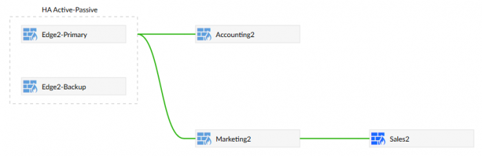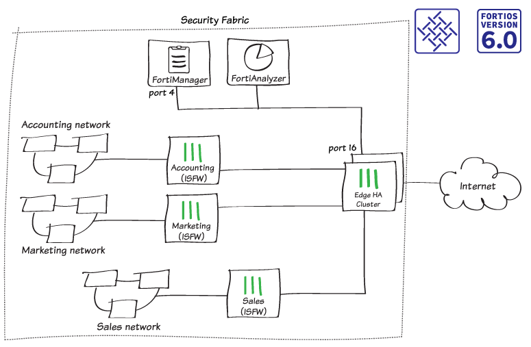 ในกรณีนี้จะเพิ่ม FortiManager ลงใน Security Fabric วิธีนี้ช่วยลดความยุ่งยากในการจัดการเครือข่ายเนื่องจากคุณจัดการอุปกรณ์ FortiGate ทั้งหมดในเครือข่ายของคุณจาก FortiManager ในตัวอย่างนี้คุณเพิ่ม FortiManager ไปยัง Security Fabric ที่มีอยู่โดยมี cluster HA ชื่อ Edge เป็น root FortiGate และอีก 3 FortiGates ภายใน: Accounting, Marketing, และ Sales. Network resources เช่น FortiManager ตั้งอยู่บน subnet 192.168.65.x
