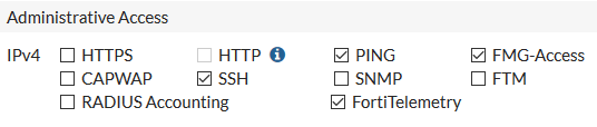 => กำหนดค่า “Administrative Access” โดยเลือกค่า FMG-Access และ FortiTelemetry เพิ่มเข้ามา