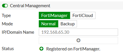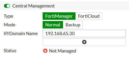 => ตั้งค่า “Type” เป็น FortiManager, “Mode” เป็น Normal และตั้งค่า “IP/Domain Name” เป็น IP Address ของ port 4 บน FortiManager