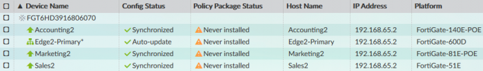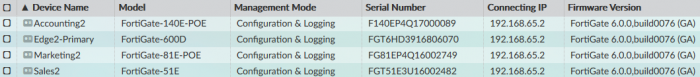 FortiGate devices จะอยู่ในรายการ Managed FortiGate และปรากฏเป็นส่วนหนึ่งของกลุ่ม Security Fabric โดยเครื่องหมาย * ในตารางจะบ่งชี้ว่าอุปกรณ์นั้นเป็น root FortiGate ใน Security Fabric