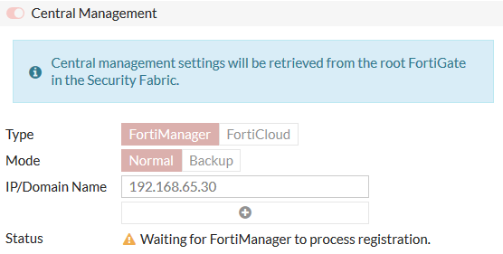 3.7 ไปที่ "Security Fabric > Settings" ภายใต้ Central Management, แถบ Status จะขึ้นว่า “Registered on FortiManager”