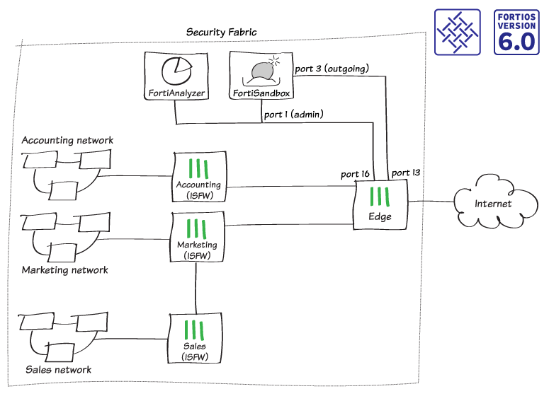 ตัวอย่างนี้ใช้การกำหนดค่า Security Fabric ที่สร้างขึ้นใน Collection ของ Fortinet Security Fabric โดย FortiSandbox จะเชื่อมต่อกับ Root FortiGate ใน Security Fabric หรือที่รู้จักในชื่อ External โดยมีสองการเชื่อมต่อระหว่างอุปกรณ์ :