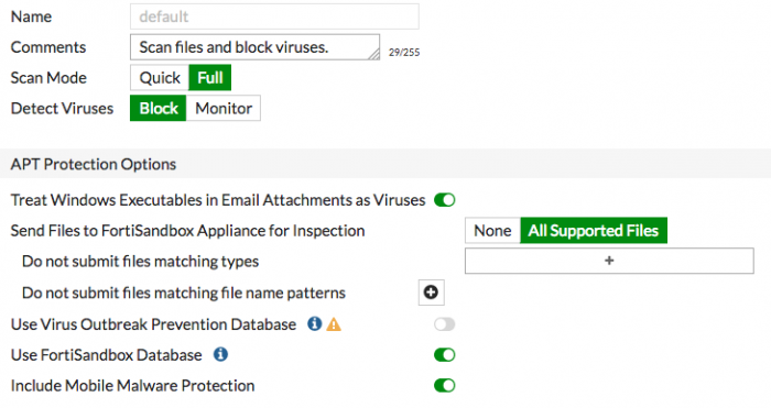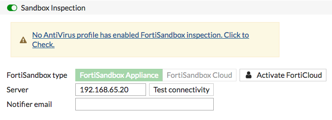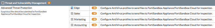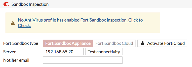 ในการผ่านการตรวจสอบการป้องกันภัยคุกคามขั้นสูง (Advanced Threat Protection) คุณจะต้องเพิ่ม Sandbox inspection ไปยัง Antivirus profiles สำหรับอุปกรณ์ FortiGate ทั้งหมดใน Security Fabric