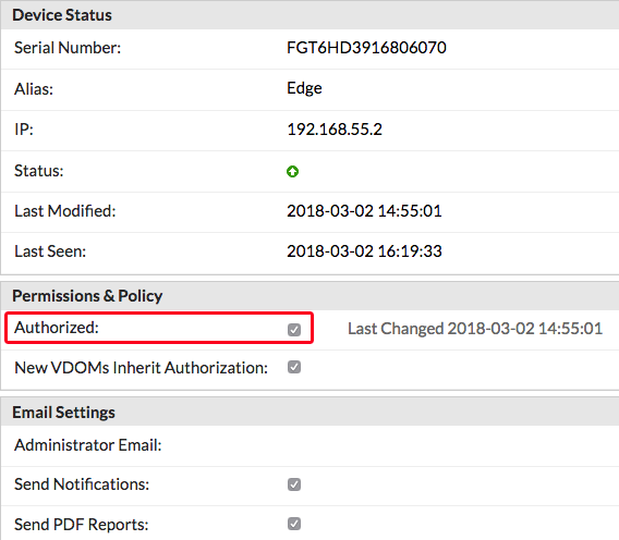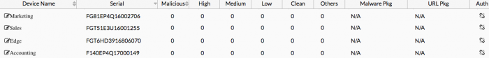 4.4 => บน FortiSandbox ไปที่ “Scan Input > Device” FortiGates ใน Security Fabric (Edge, Accounting, Marketing และ Sales) จะแสดงรายการ แต่ Column Auth จะระบุว่าอุปกรณ์ไม่ได้รับอนุญาต