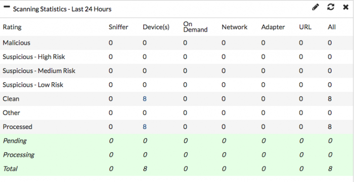 => บน FortiSandbox, ให้ไปที่ “System > Status” และดู “Scanning Statistics” widget สำหรับข้อมูลสรุปของไฟล์ที่สแกน