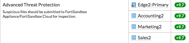 => ในตัวอย่าง อุปกรณ์ FortiGate ทั้งสี่ ใน Security Fabric ผ่านการตรวจสอบการป้องกันภัยคุกคามขั้นสูง (Advanced Threat Protection) และ Security Rating Score จะเพิ่มขึ้น 9.7 คะแนนสำหรับแต่ละ FortiGate