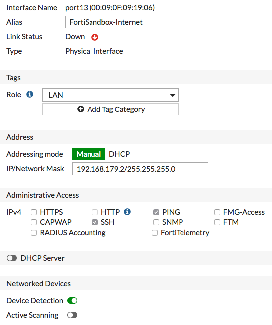 => ในการกำหนดค่า Port ที่เชื่อมต่อกับ Port 3 บน FortiSandbox (ในตัวอย่างเป็น Port 13) ให้ไปที่ “Network > Interfaces” ตั้งค่า "IP/Network Mask" เป็น Address บน Subnet เดียวกันกับ Port 3 บน FortiSandbox (ในตัวอย่างเป็น 192.168.179.2/255.255.255.0)