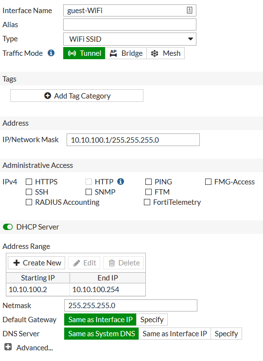 => ตั้งค่า “Traffic Mode” เป็น Tunnel to Wireless Controller กำหนด “IP/Network Mask” ให้กับ Interface และเปิดใช้งาน “DHCP Server”