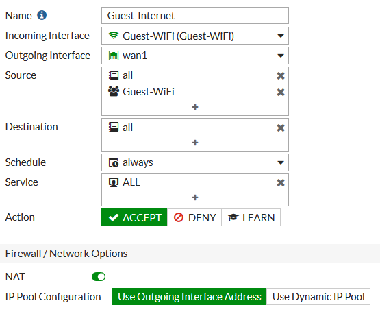 => ตั้งค่า “Incoming Interface” เป็น Guest SSID และตั้งค่า “Outgoing Interface” เป็น Interface ที่เข้ากับอินเทอร์เน็ตของคุณ เลือก “Source” และตั้งค่า “Address” เป็น All และ “User” เป็น Guest user group, ตั้งค่า “Service” เป็น All
