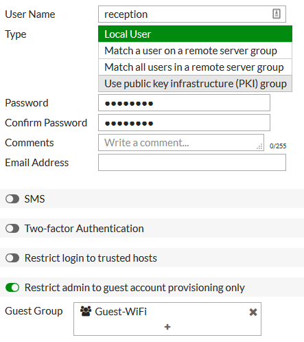 => เปิดใช้งาน “Restrict admin to guest account provisioning only” และตั้งค่า “Guest Group” เป็น WiFi guest user group