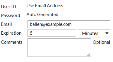 => ตั้งค่า “Email” เป็น Email address ของ User (ในตัวอย่าง, ballen@example.com) ในการทดสอบ Account ให้ตั้งค่า “Expiration” เป็น 5 Minutes