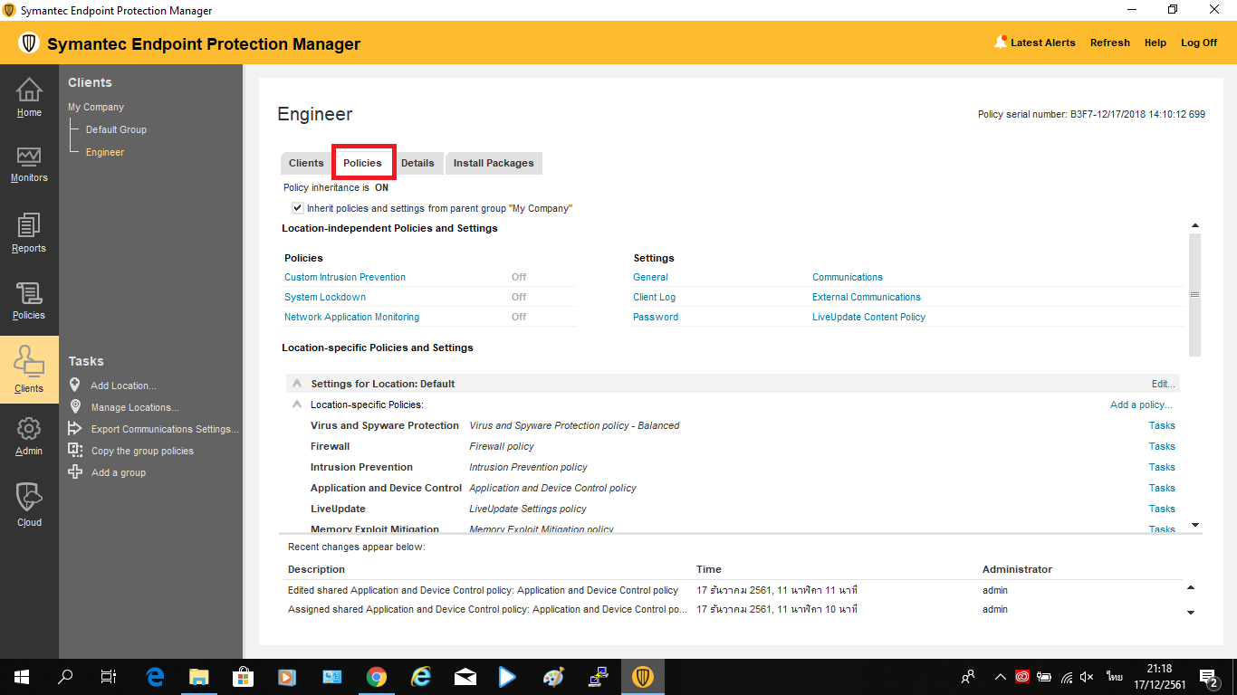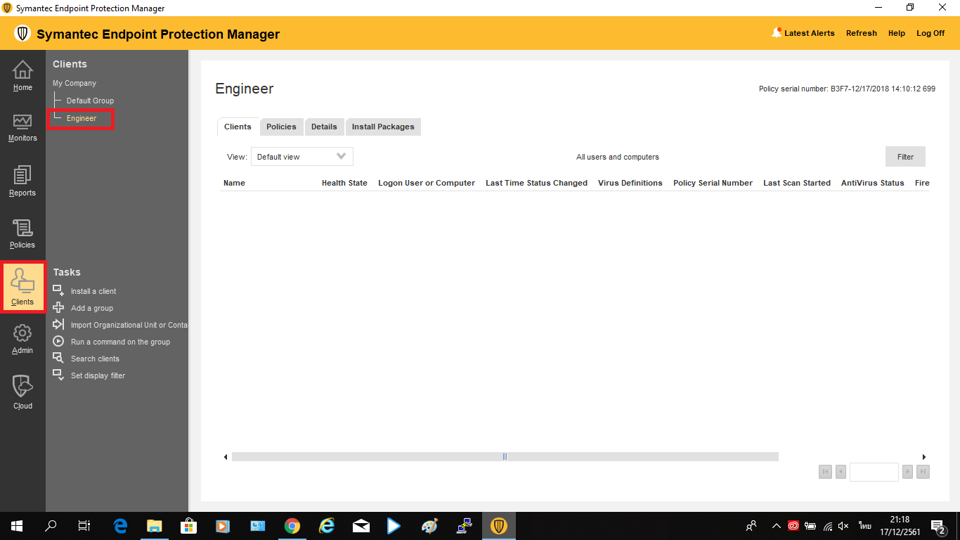 • 1. กดเข้าไปที่ Clients ที่แถบเครื่องมือด้านซ้ายของโปรแกรม จากนั้นเลือก Group ที่ไม่ต้องการใช้ Policy ที่สืบทอดมาจาก Group “My Company” (ในที่นี้เลือก Group Engineer)