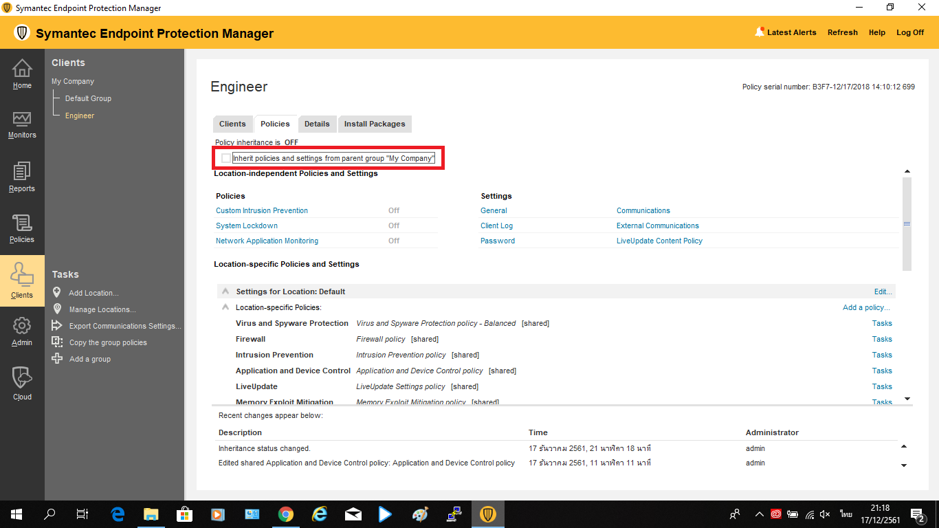 3. Uncheck หน้า Inherit policies and settings from parent group “My Company”