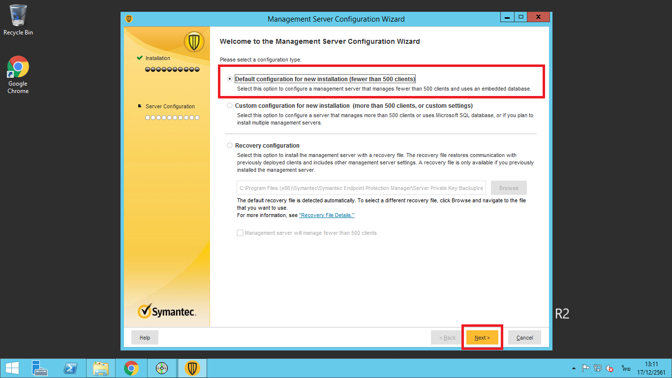 13. เลือก “Default configuration for new installation (fewer than 500 clients)” จากนั้นกด “Next”