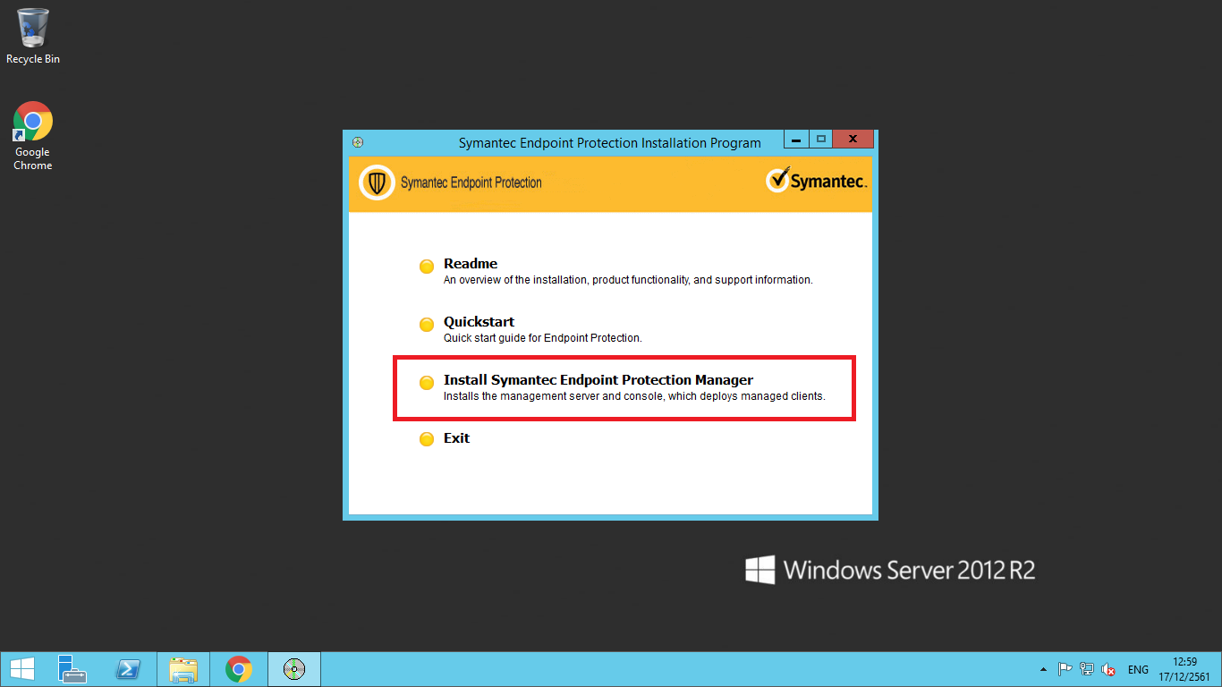 6. หลังจากดาวน์โหลดเสร็จแล้ว เปิดไฟล์ที่ดาวน์โหลดขึ้นมา จากนั้นเลือก “Install Symantec Endpoint Protection Manager”