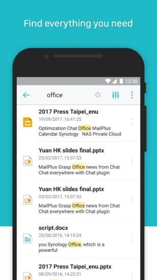 Drive ช่วยให้สามารถเข้าถึง และจัดการไฟล์ในไดรฟ์ Synology ได้อย่างง่ายดาย นอกเหนือจากประเภทไฟล์ทั่วไป เช่น เอกสาร, รูปภาพ, วิดีโอ และเพลง อีกทั้งยังสามารถเปิดเอกสาร spreadsheets และสไลด์ของ Synology Office ในมุมมองที่ใช้งานง่ายโดยไดรฟ์ นอกจากนี้คุณลักษณะต่างๆ ของการค้นหา, การใช้งานร่วมกัน, การย้าย และการใช้ป้ายกำกับกับไฟล์ก็มีให้บริการบนอุปกรณ์ทั้งหมด ซึ่งจะช่วยให้ผู้ใช้สามารถทำงานได้อย่างมีประสิทธิภาพทุกที่ทุกเวลา