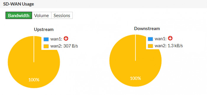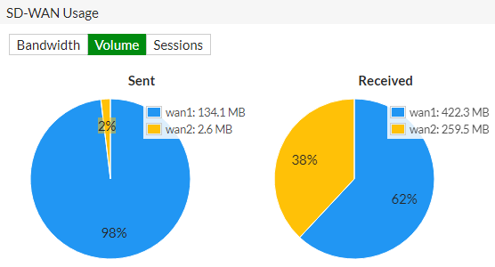 => ในส่วน “SD-WAN Usage” คุณสามารถดู Bandwidth, volume และ sessions สำหรับการรับส่งข้อมูลบน SD-WAN interfaces