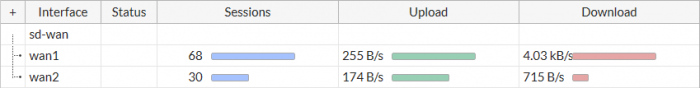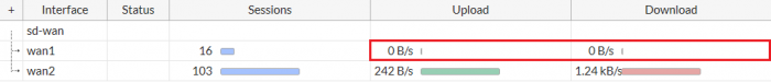 => ไปที่ “Monitor > SD-WAN Monitor” เพื่อดูจำนวน sessions, Bit rate และข้อมูลเพิ่มเติมสำหรับแต่ละ Interface