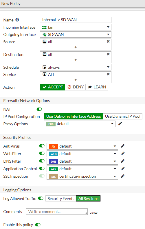 => เปิดใช้งาน “NAT” และใช้ Security Profiles ตามต้องการ