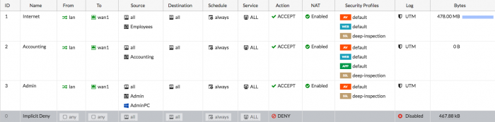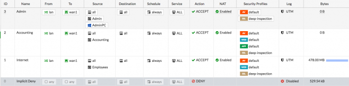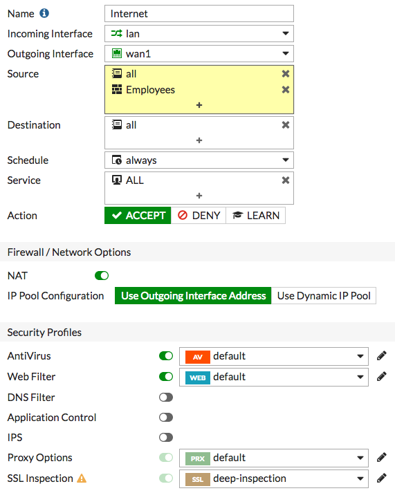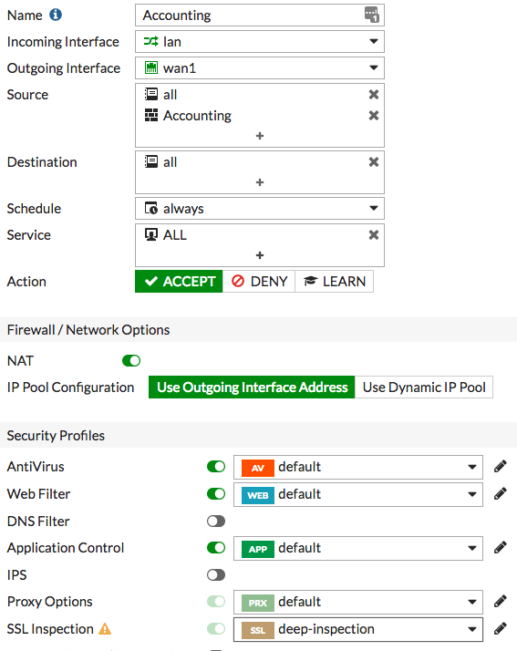 => Accounting : Policy ที่ Accounting user group ใช้เพื่อเข้าถึงอินเทอร์เน็ต คุณใช้ FortiGate เพื่อใช้การตรวจสอบความปลอดภัยที่เพิ่มขึ้นเพื่อปกป้องข้อมูลที่มีความละเอียดอ่อน