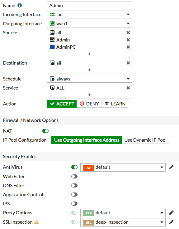 => Admin : Policy ที่ Admin user group ใช้เชื่อมต่อจากคอมพิวเตอร์ที่เฉพาะเจาะจงเพื่อเข้าถึงอินเทอร์เน็ต คุณใช้ FortiGate เพื่อตรวจสอบความปลอดภัยอย่างจำกัด
