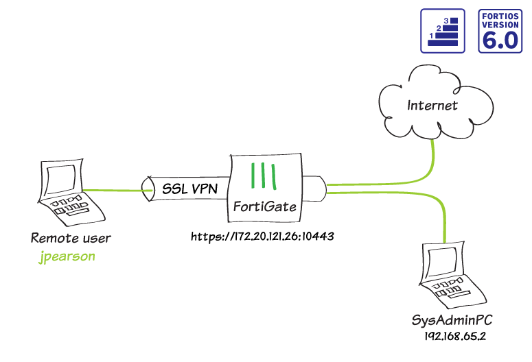 ในตัวอย่างนี้คุณจะอนุญาตให้ User Remote เข้าถึงเครือข่ายขององค์กรโดยใช้ SSL VPN เชื่อมต่อด้วยWeb mode โดยใช้ Web Browser หรือ Tunnel mode โดยใช้ FortiClient