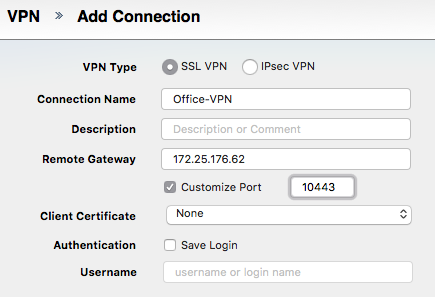 => ตั้งค่า “VPN Type” เป็น SSL VPN, ตั้งค่า “Remote Gateway” เป็น IP ของ Listening FortiGate interface (ในตัวอย่าง, 172.25.176.62), เลือก “Customize Port” และตั้งค่าเป็น 10443