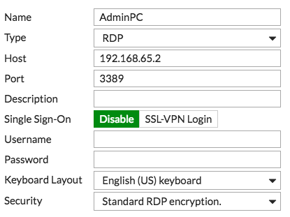 1.2 => ภายใต้ “Enable Web Mode”, ให้สร้าง Predefined Bookmarks สำหรับทรัพยากรภายใน (Internal resources) ที่ SSL VPN users ต้องเข้าถึง ในตัวอย่าง, Bookmark อนุญาตให้ผู้ใช้ระยะไกลเข้าถึง RDP กับคอมพิวเตอร์บนเครือข่ายภายใน