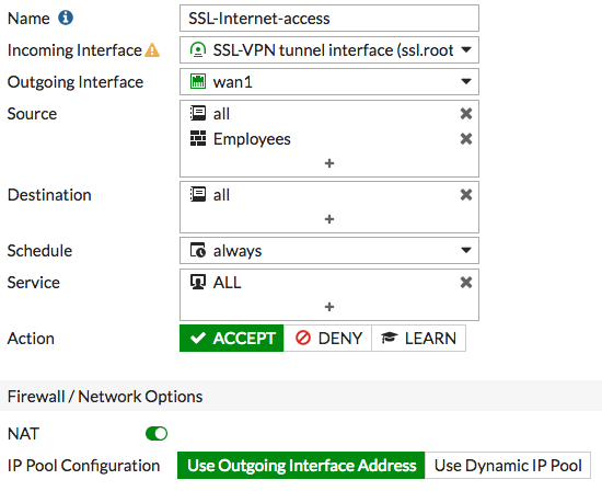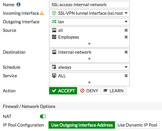 => ตั้งค่า “Incoming Interface” เป็น ssl.root และ “Outgoing Interface” เป็น lan เลือก “Source” และตั้งค่า “Address” เป็น All และ “User” เป็น Employee user group, ตั้ง “Destination Address” เป็น Local network address, “Service” เป็น All และเปิดใช้งาน “NAT”