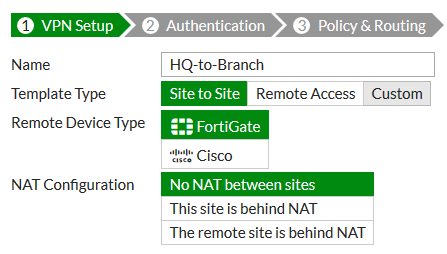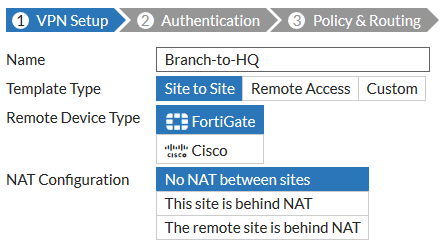=> ในขั้นตอน “VPN Setup”, ตั้งค่า “Template Type” เป็น Site to Site, ตั้งค่า “Remote Device Type” เป็น FortiGate และตั้งค่า “NAT Configuration” เป็น No NAT between sites