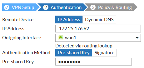 2.2 => ในขั้นตอน “Authentication”, ตั้งค่า “IP Address” เป็น Public IP address ของ HQ FortiGate (ในตัวอย่าง, 172.25.176.62)