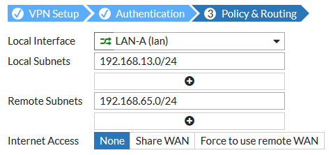 1.3 => ในขั้นตอน “Policy & Routing”, ให้ตั้งค่า “Local Interface” เป็น Lan, จากนั้น Wizard จะเพิ่ม Local subnet ในเครื่องโดยอัตโนมัติ ตั้งค่า “Remote Subnets” เป็น Subnet ของ Branch network (ในตัวอย่าง, 192.168.13.0/24)
