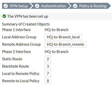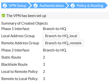 1.4 => หน้าสรุป (Summary page), จะแสดงการกำหนดค่าที่สร้างขึ้นโดยตัวช่วยสร้าง (Wizard) รวมถึง Interfaces, Firewall addresses, Routes และ Policies