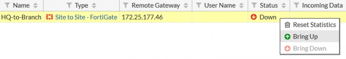 2.5 => ในการ Bring up VPN tunnel, ให้ไปที่ “Monitor > IPsec Monitor” คลิกขวาภายใต้ “Status” และเลือก “Bring Up”